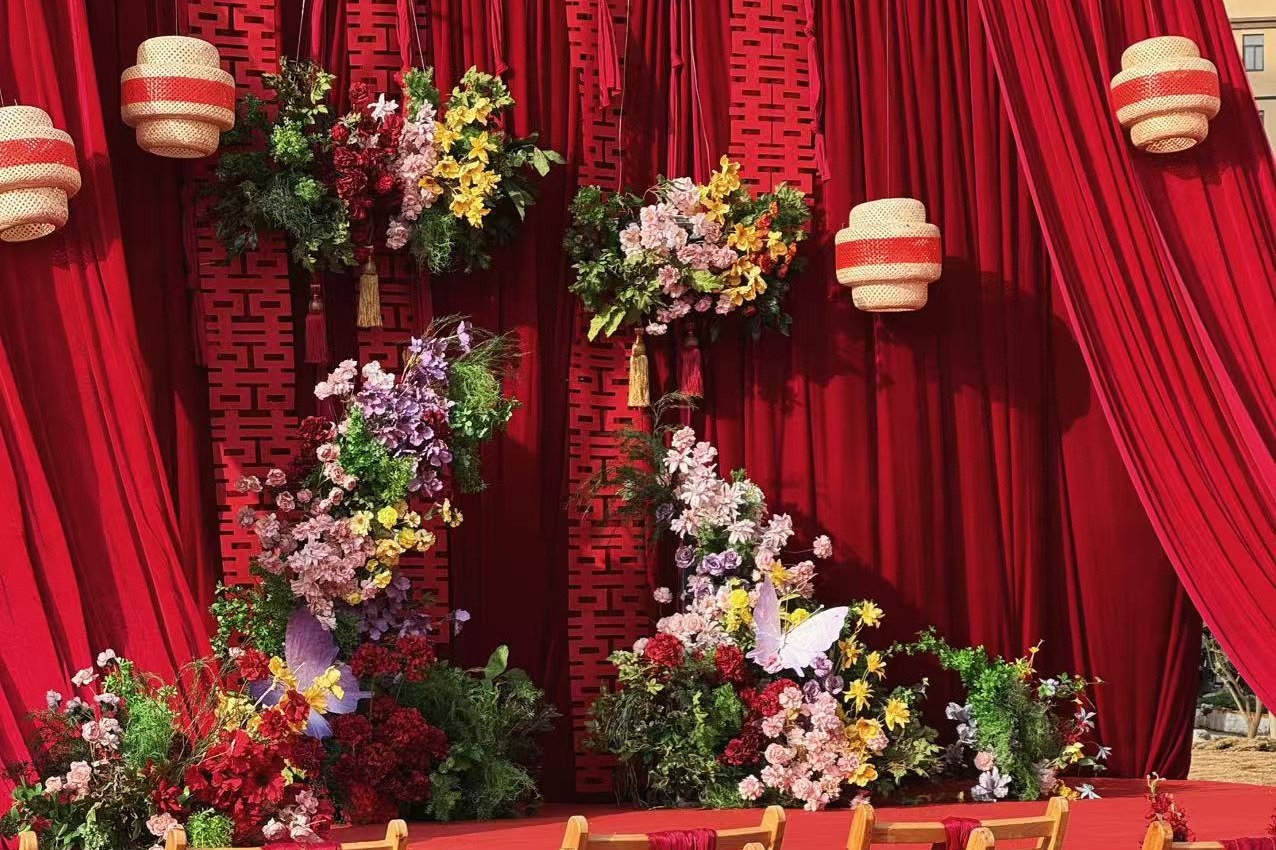 套餐区域:1.舞台区域:搭建舞台基础台,台面红色地毯铺盖;搭建桁架背景,悬挂红色布幔、长条喜字、花艺以及灯笼装饰; 2.观礼区:整个区域铺红色地毯,木制折叠椅40把(椅背纱); 3.通道区:仿真地排花艺; 4.出场区:竹篾簸箕、KT板、复古灯笼、花艺、瓦片及一些小道具装饰; 套餐设备:音响一套; 套餐备注:此套餐均为仿真花价格,可自行选择是否使用鲜花; 此套餐价格为潜江市区内报价,市区外则另行收取运输费; 此套餐价格在正月初一至正月十五期间均有涨幅。