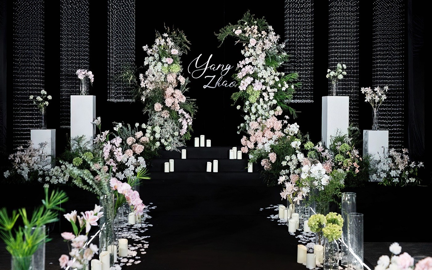 服务详情套餐区域:1.舞台区域:使用酒店舞台,台面黑色地毯铺盖,摆放白色方柱、电子蜡烛、玻璃花瓶装饰;用布艺打底作为背景;悬挂logo牌以及水晶装饰,舞台中间台阶造型,做高低柱状花艺造型;
